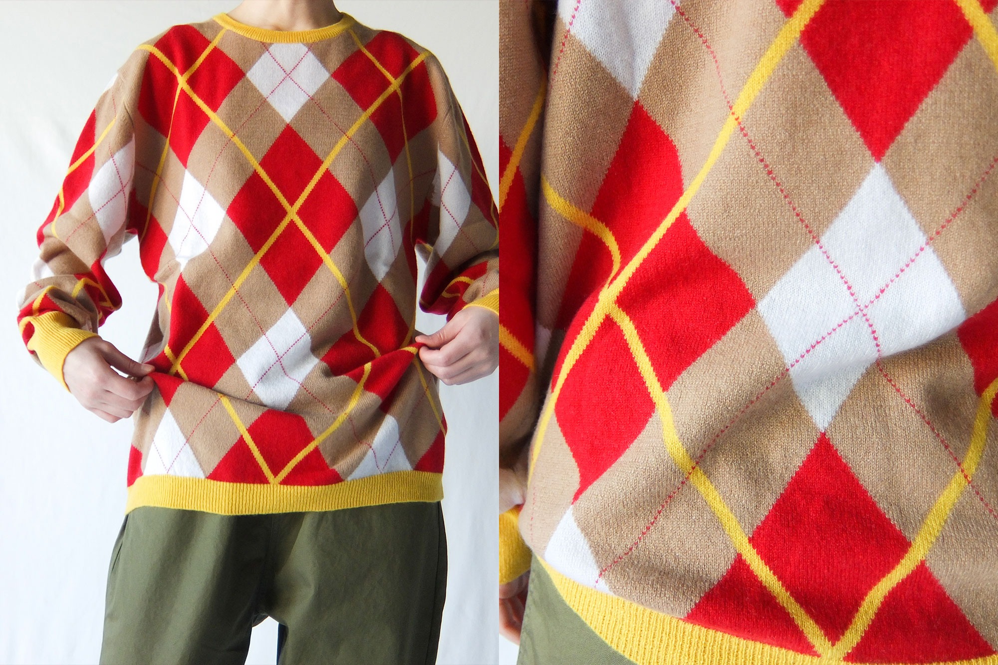 カシミア100%のアーガイルニットです。1枚で主役になるようなアーガイル柄を表現したニット。レッドやイエロー、ホワイト、ベージュの抜群のカラーリングでしっかりとコーディネートを華やかに演出してくれます。ユニセックスでご着用いただけるアイテムです。