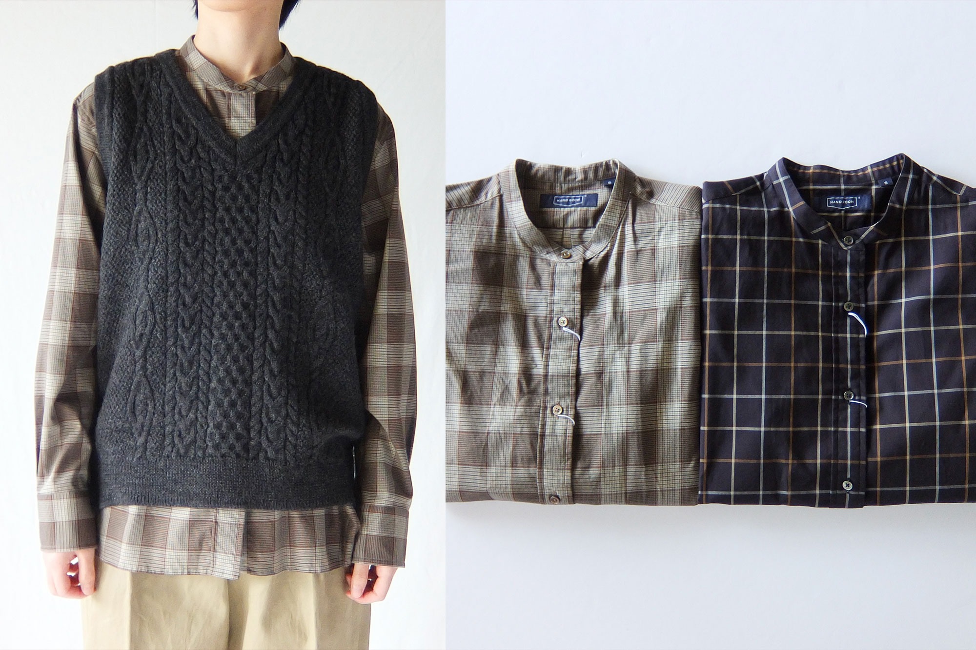 ビックチェック柄バンドカラーシャツです。ややドロップショルダーぎみのゆったりとしたシルエット。襟のないバンドカラーのデザインは秋冬のニットやベストとの重ね着とも相性が良く、襟が重たくならないのでジャケットやコートとも合わせやすくなっています。ネイビーとブラウングレンチェックの2色展開です。