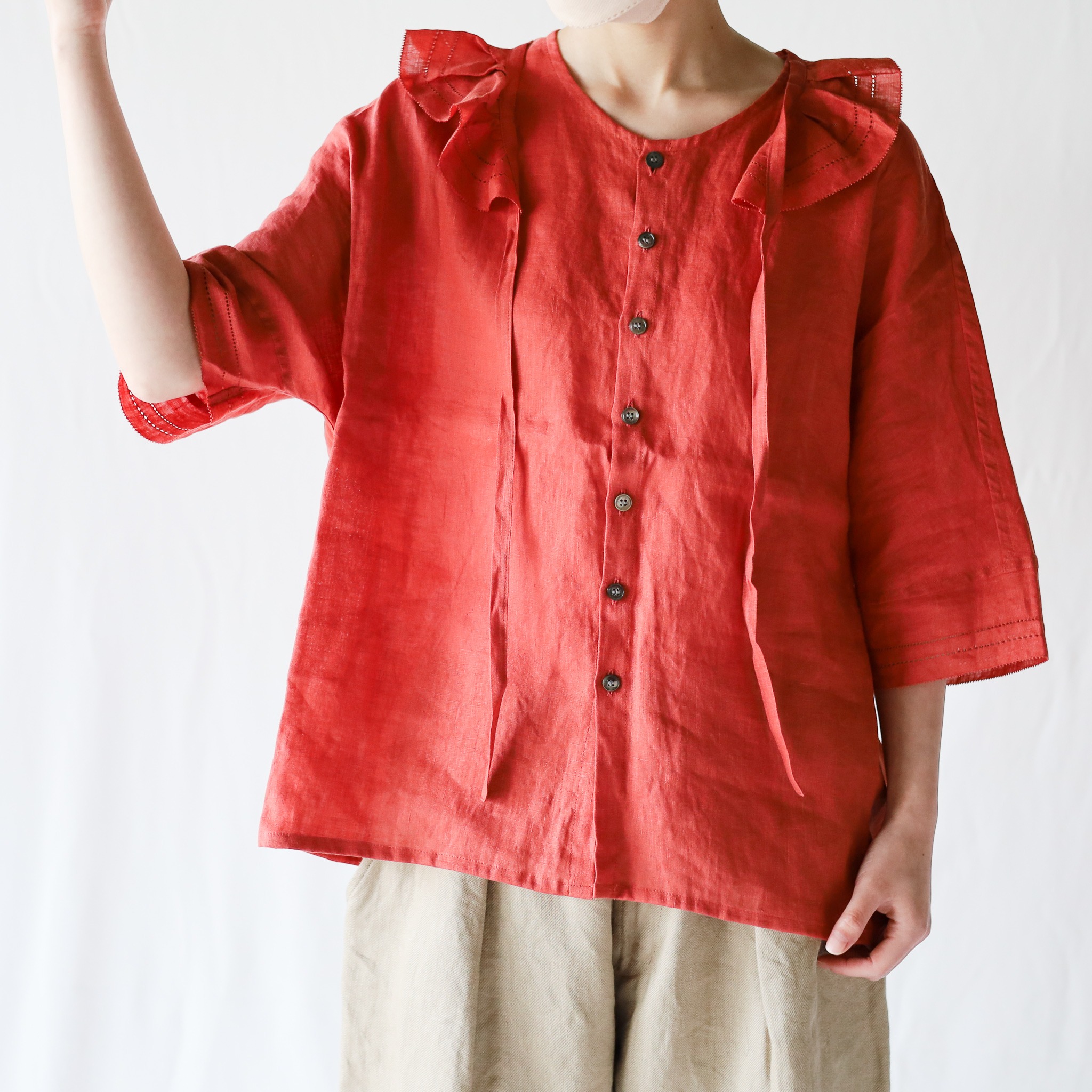 リネン素材と言っても中肉厚のしっかりとした生地感なので、今はプルオーバーとして着たり、半袖と合わせたり、涼しくなったらブラウスや長袖シャツとレイヤードして楽しむことができます。セットアップとしてもこなれた雰囲気で素敵ですよ。