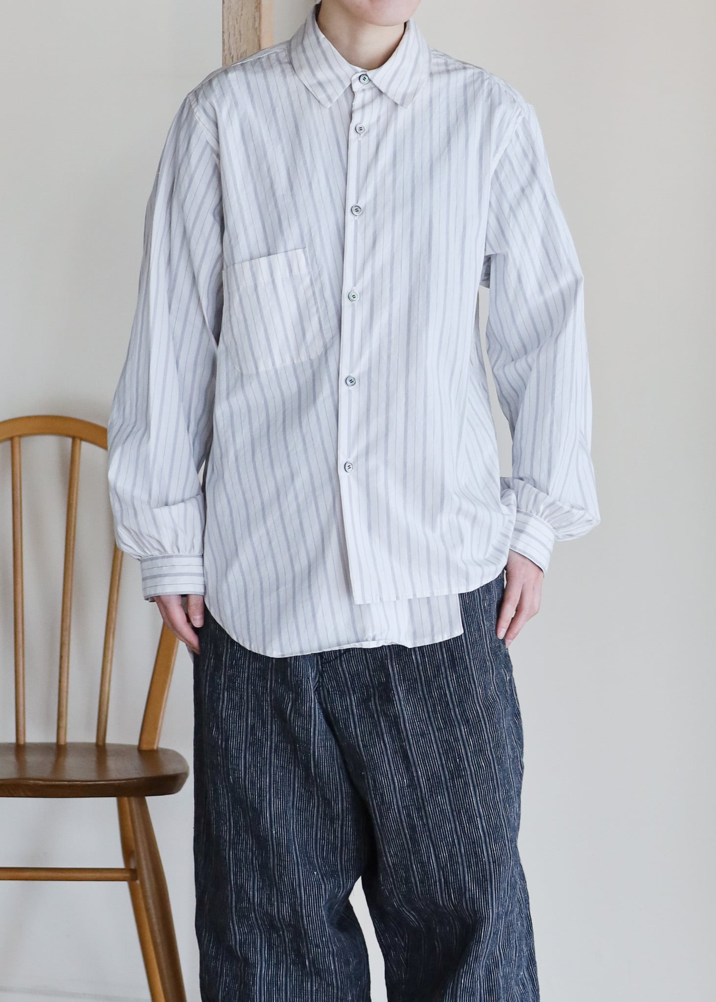 トラッドなストライプ柄が爽やかな、清涼感のあるコットン素材を使用。ドライタッチな風合いに仕上げ、柔らかさを引き出すため少量ずつ丁寧に揉み洗った生地です。オフホワイトで1枚ではもちろん、重ね着や着回しにも万能なクラシカルなアイテムです。