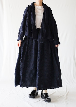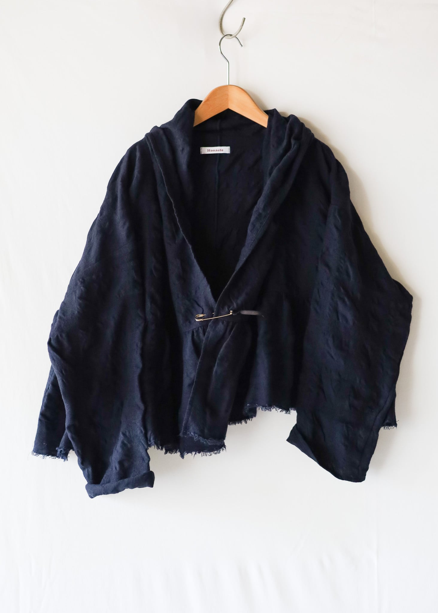 専用のゴールドビックピンが付属しており、前を留めても◎ さっと羽織ることでこなれた着こなしになる、雰囲気のある1枚です。こちらのカラーは、ネイビーです。(色展開はネイビーとカーキの2色)
