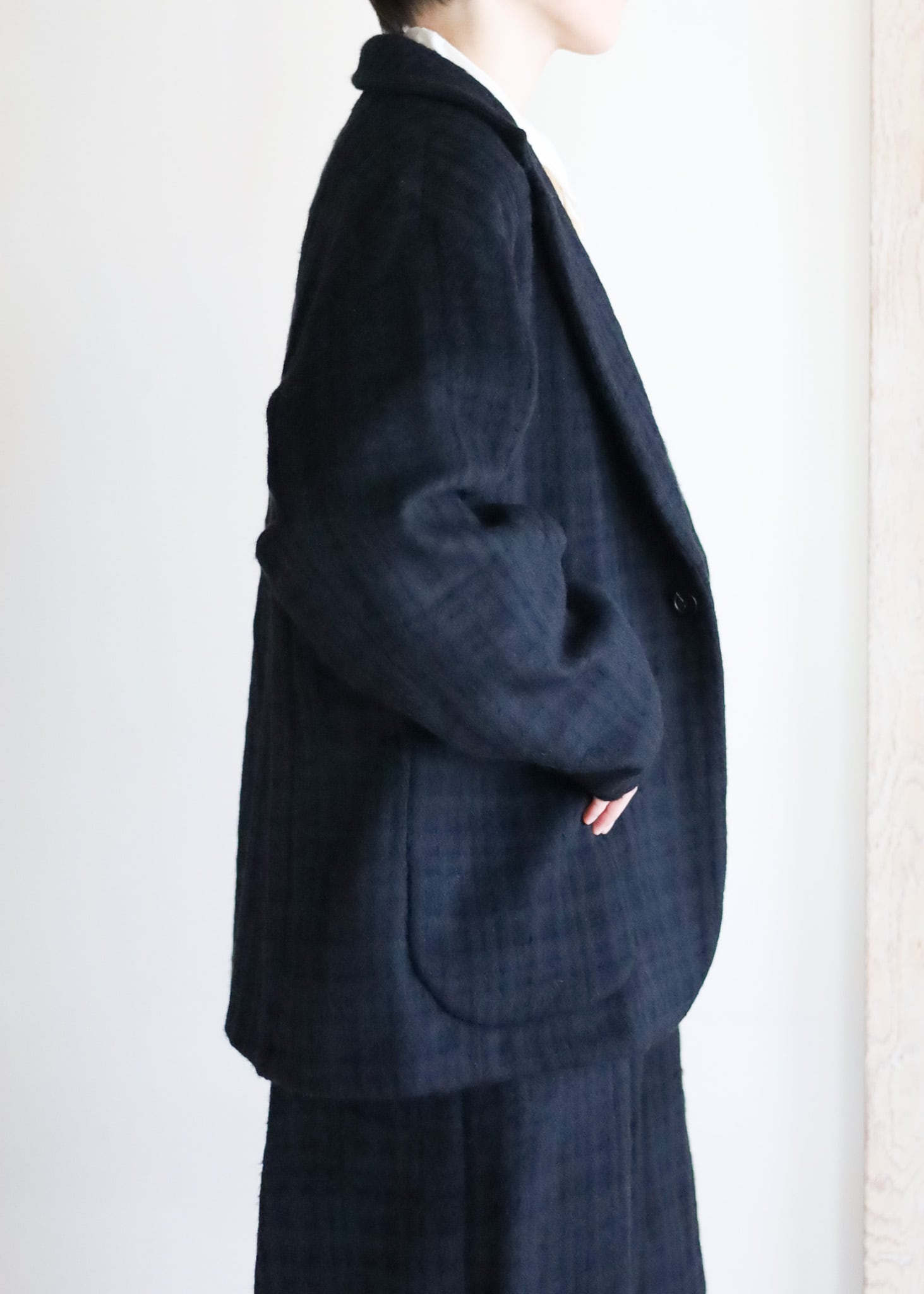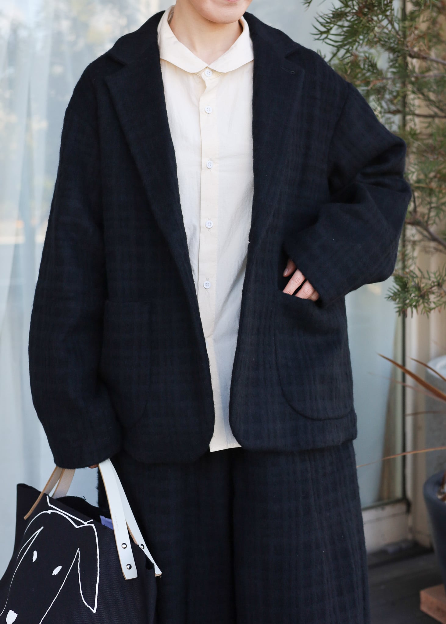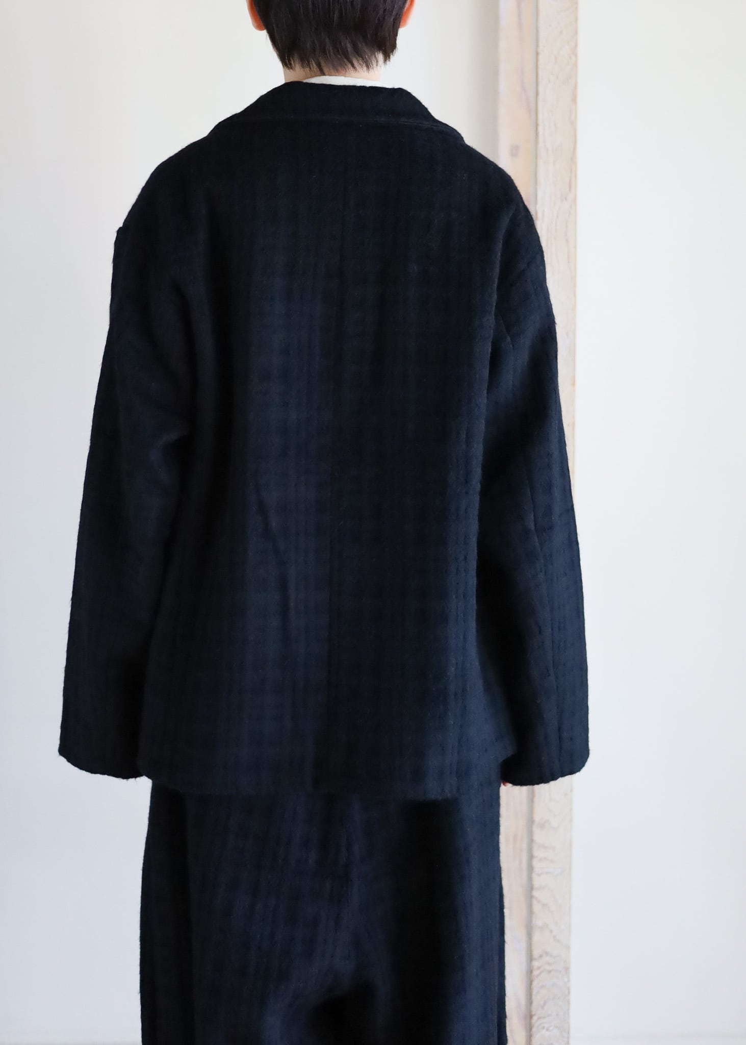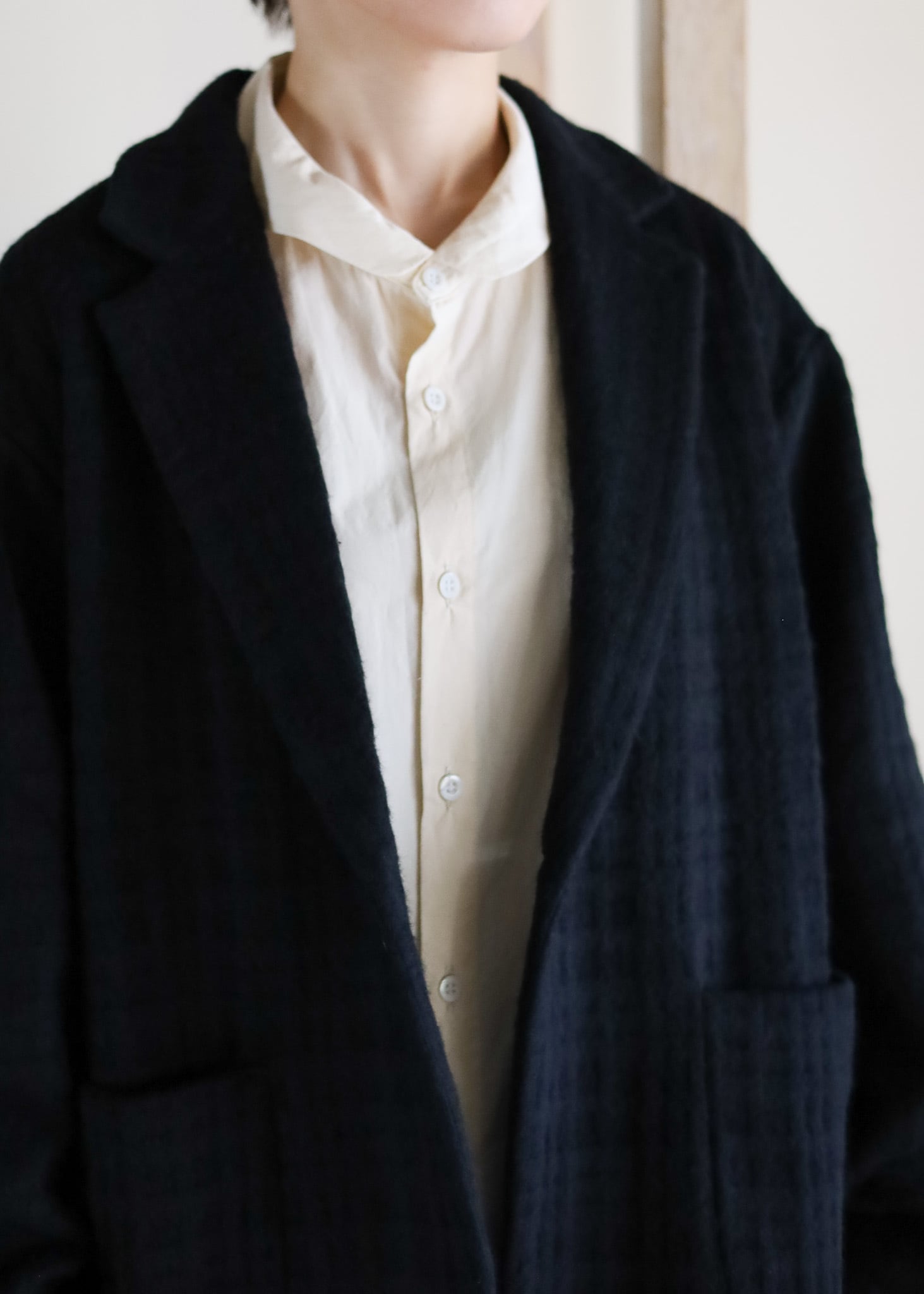 ウール混の柔らかな温もりを感じる生地に、控えめなシャドウチェックを織りで表現した一着。黒地に浮かぶさりげないチェックは、光の当たり方で深みが生まれ、ほぼ無地のように上品になじみつつも、しっかりと存在感を放ちます。
