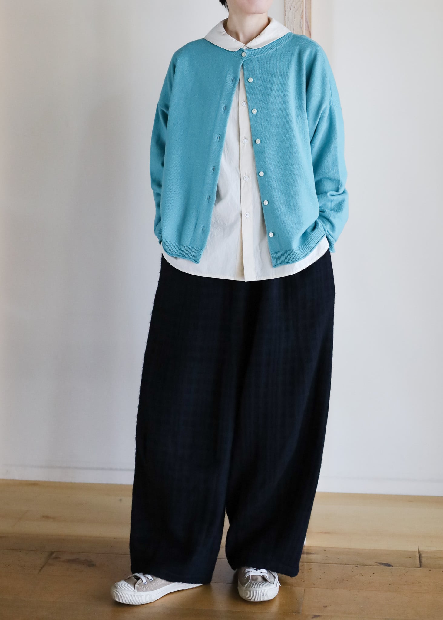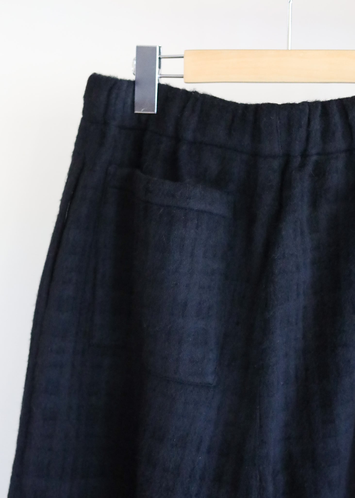 深めの股上でゆったりとしながら、すっきりと女性らしさもあるデザイン。程よく丸みのある太めのシルエットです。軽やかであたたかく、ウエストはゴムでリラックス感のある履き心地。