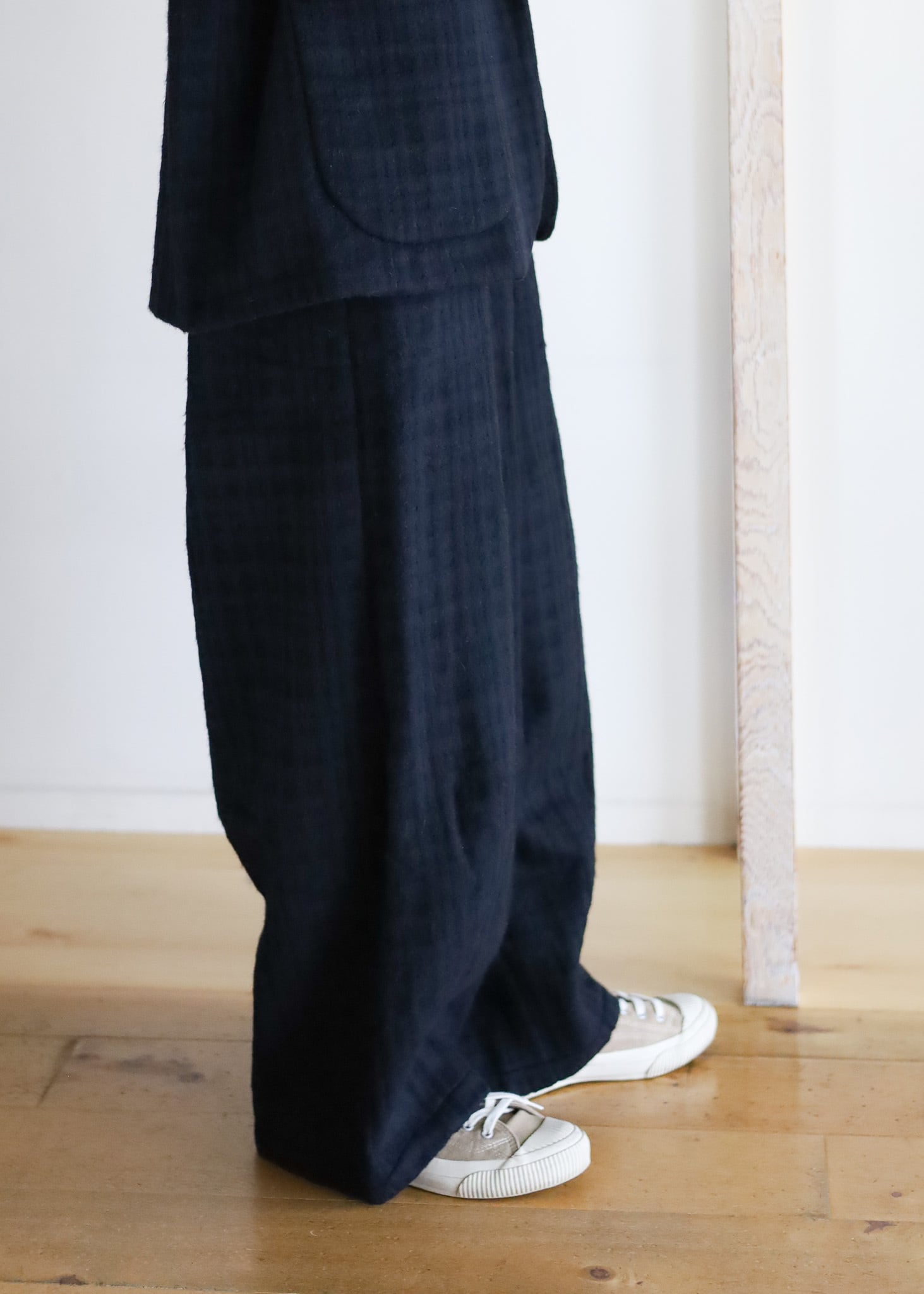ウール混の柔らかな温もりを感じる生地に、控えめなシャドウチェックを織りで表現した一着。黒地に浮かぶさりげないチェックは、光の当たり方で深みが生まれ、ほぼ無地のように上品になじみつつも、しっかりと存在感を放ちます。