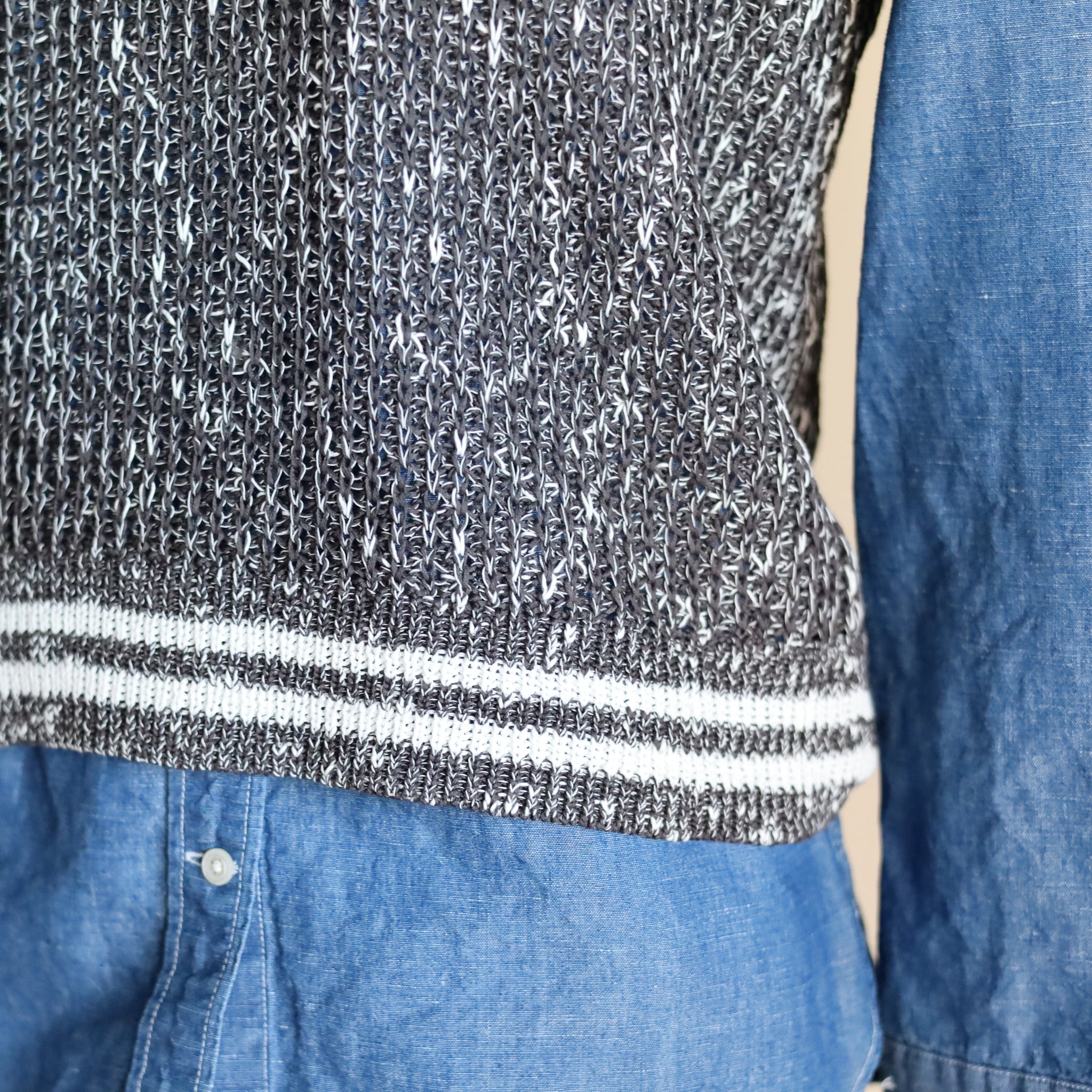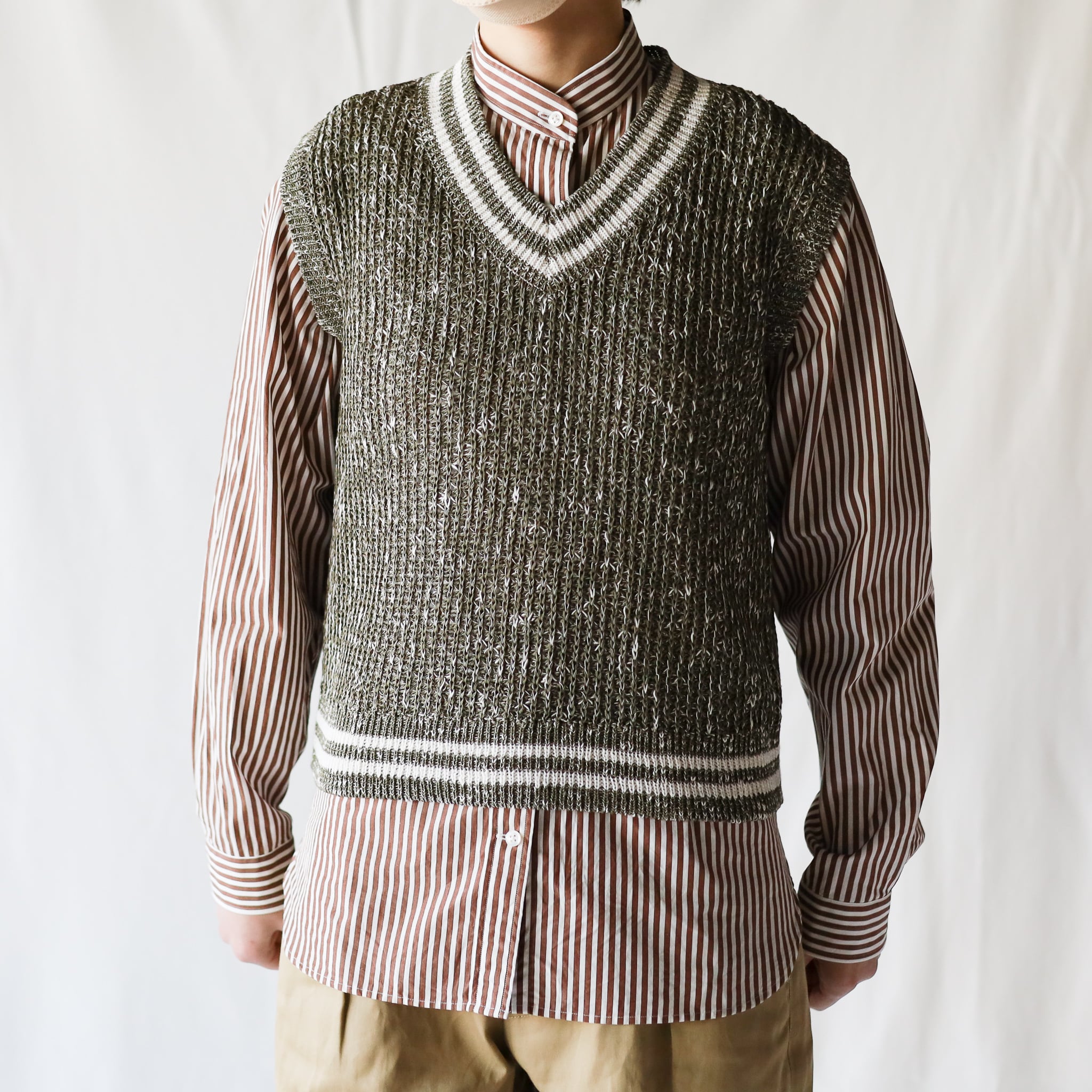 風合いのあるコットン素材を編み込んだコンパクトなベストです。ネック部分と裾のラインがクラシカルな印象。ブラウスやシャツとのレイヤードはもちろん、夏にはTシャツとのコーデも楽しめます。