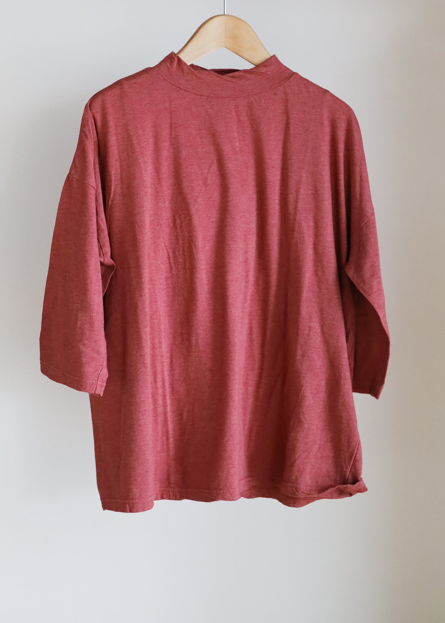 綿のカジュアルさに、シルクのしなやかさをプラスした、極上の一年中使える薄手天竺カットソーです。ゆったりとしたシルエットにドロップショルダーで、袖は7分程度の袖丈。モックネックで1枚でもさらっと着やすいTシャツです。