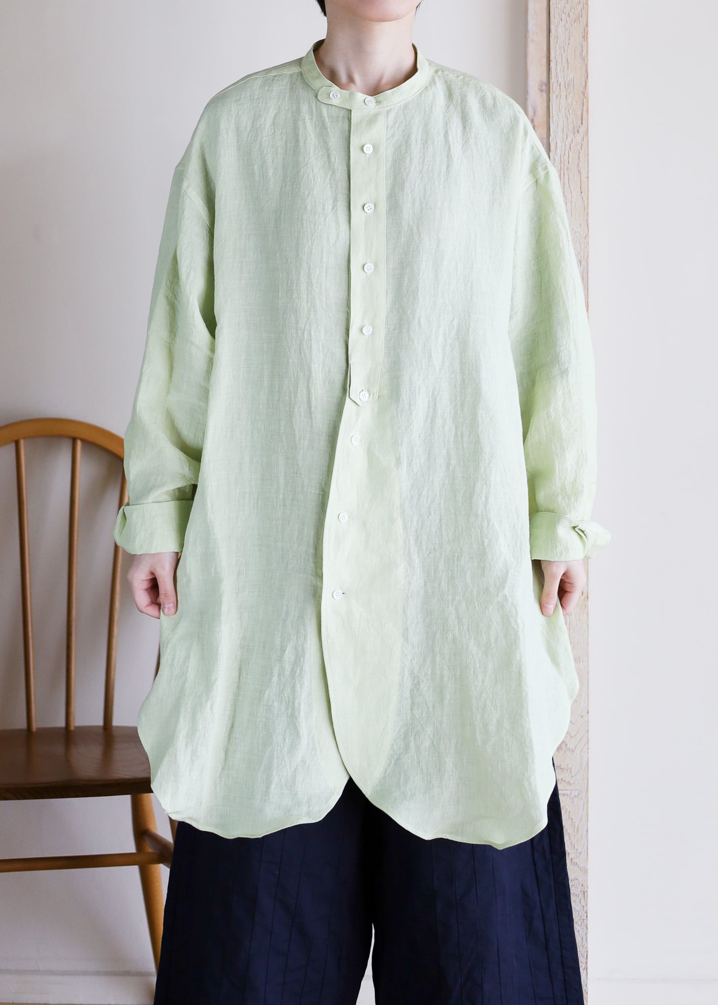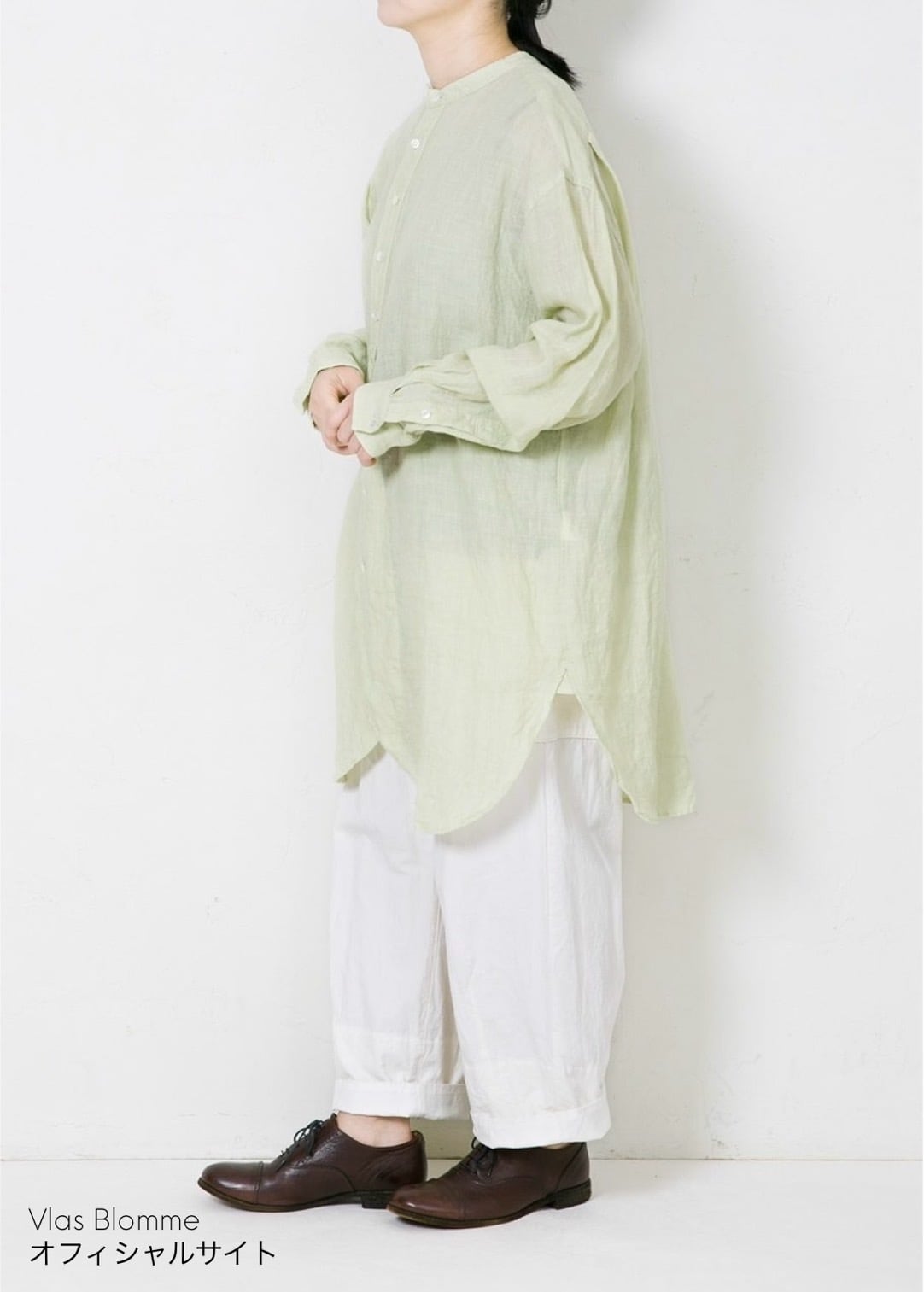 シンプルで使いやすい定番チュニックシャツ。アンティークのシャツに見られる、前立てが大きくラウンドしたデザインが特徴です。全体的にゆったりとしたシルエットで、シンプルで合わせやすく、前を開けたり、無造作に袖をまくった羽織りスタイルなど、年間を通して様々なアレンジを楽しめる1枚です。